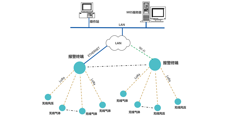报警终端无线读取监测点上传的数据,进行处理、显示、报警;并将数据通过局域网,MQTT协议,上传至MES。