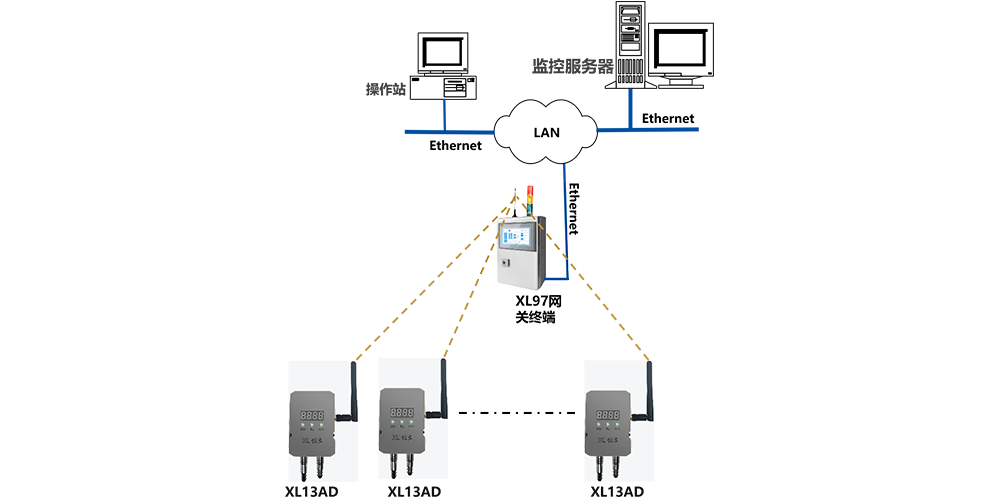 现场需要局部集中监视时,可配置XL97网关终端,读取区域内XL13AD上传的数据,分析处理、显示、报警,并转发至监控中心服务器。